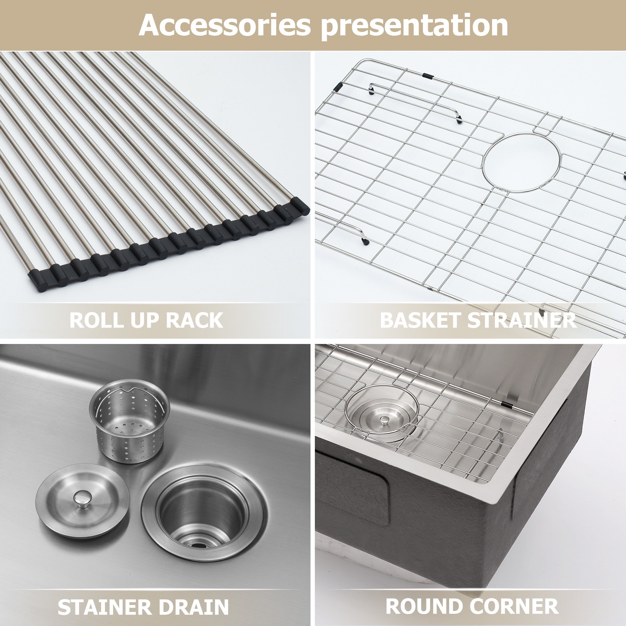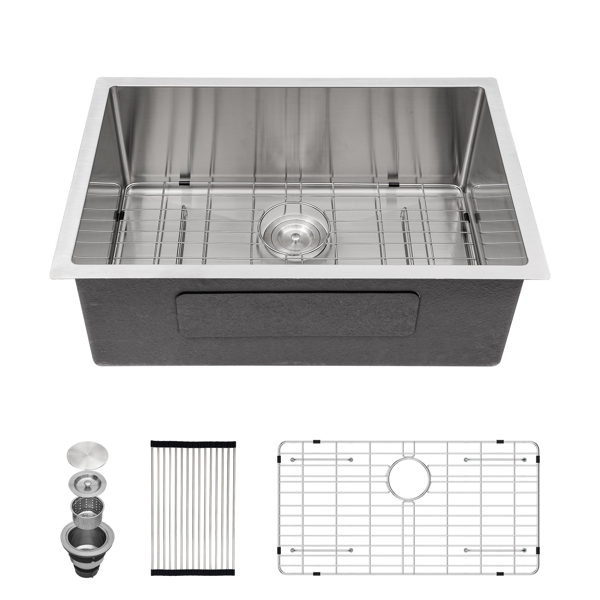 What's in the box: a stainless steel sink; a sink bottom grid;a roll up drying rack;a basket strainer;mounting hardware;installation and operation instruction.
