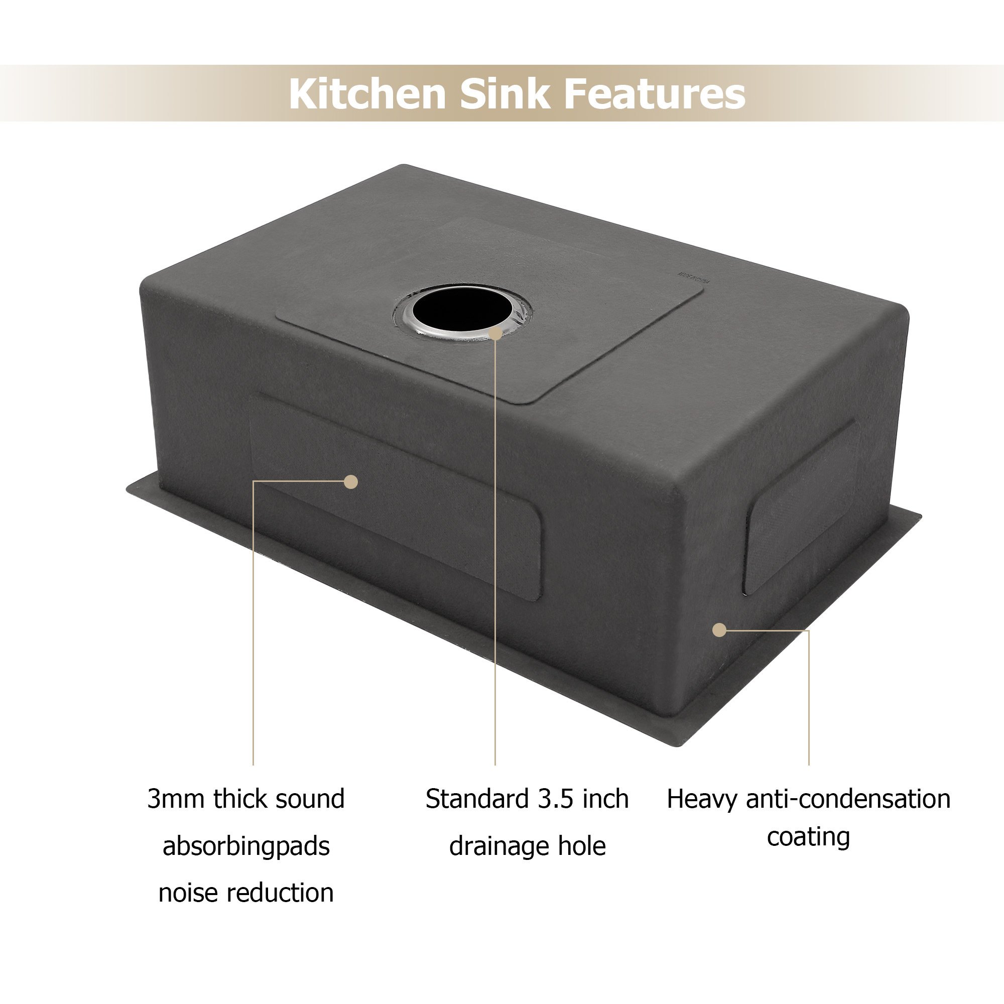 4.The single bowl kitchen sink has 3mm thick rubber pads,good for sound absorbtion,heavy paint coating,protect cabinet from condensation.
