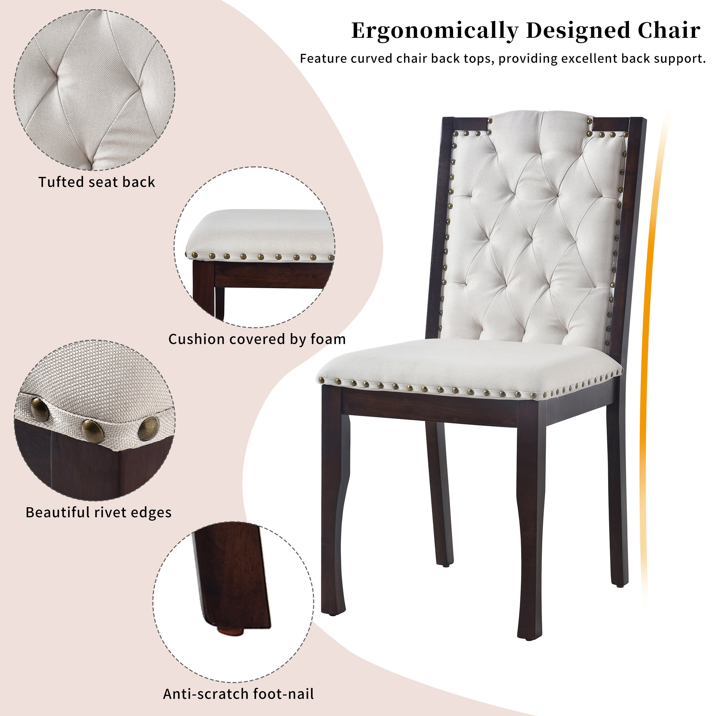 EXCELLENT CRAFTSMANSHIP AND COMFORT - The attention to detail in this set of six dining table and chairs is reflected in the soft and comfortable upholstered chairs with beautiful rivet accents on the backs. All four high-back upholstered table and chairs have curved backrests that provide excellent back support for comfort during long gatherings.