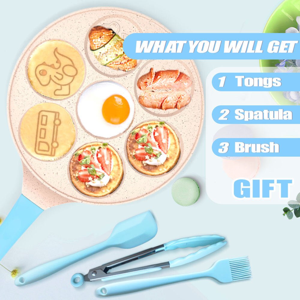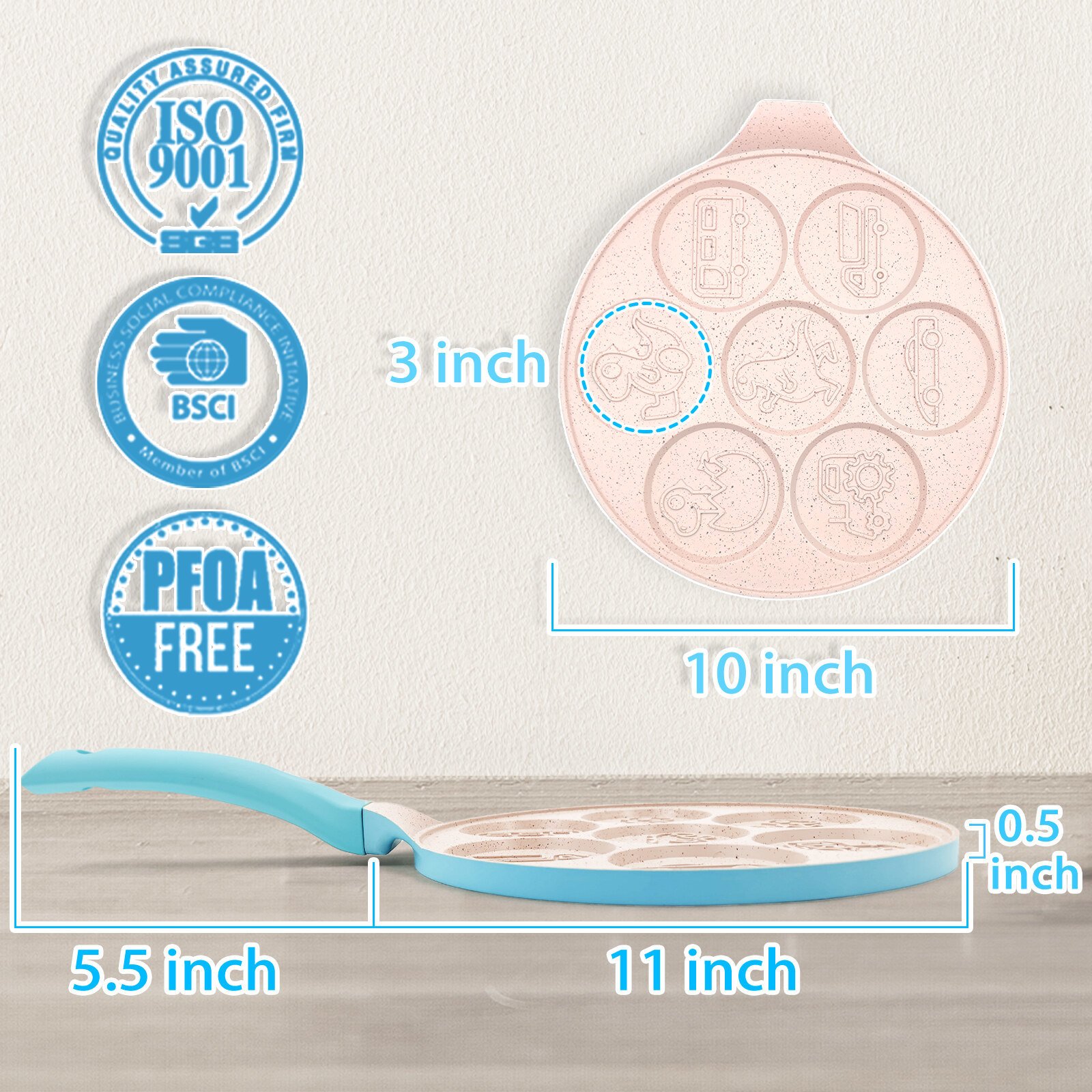 Warm Tips: Aluminum offers super conductivity, providing exceptional heat retention and distribution than traditional cast iron pan. Our non-stick pan conducts heat quickly for great performance at low heatEgg Pan Size: 10 inches diameter, 1/2 inches height, each pancake mold measure 3 inches. 17 Inches length including the silicone handle. Pan Made of die cast Aluminum7-Cups Cute Dinosaur Car, and Truck Character. Perfect for cooking omelets, bacon, burgers, pancakes, eggs,etcEvenly Heats: 7-cups pancake pan heat up faster than traditional nonstick cooking pancake pans, making cooking faster and easier, saving you effort and time for breakfast. Our Pancake pan comes with silicone spatula, tong and oil brush to help you easy cook what you wantEasy Clean and Care: This fried egg pan can cook on gas stove, grill stove. Induction Cook tops not available; Do not put in dishwasher as it will shorten the life of the nonstick coating on the pan. Just use a soft sponge or cloth to remove oil stains easily