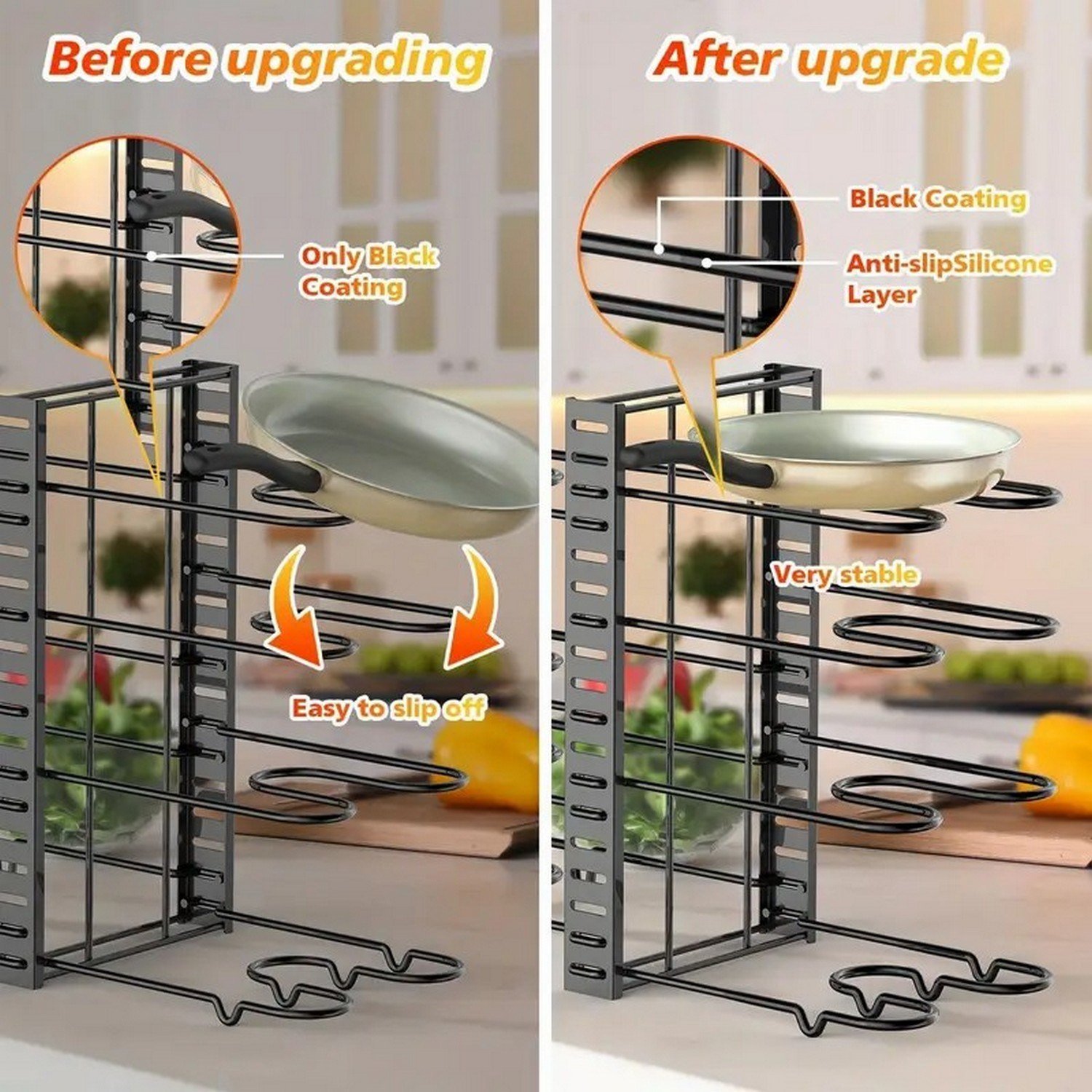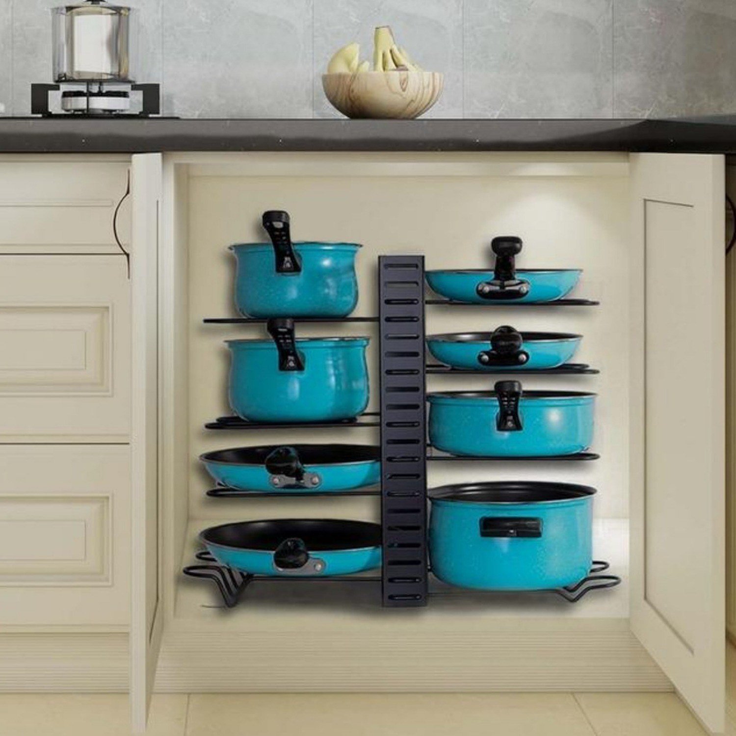 Updated Design for More Stablity - This adjustable pots and pans organizer under cabinet can keep outstanding balance during use; the extended U-turn part provides a better footing for smaller kitchen tools so that you'll have no worries about them sliding off; each divider is fitted with a rubber covering to help hold pans/pots in place and protect them from getting scratched or falling off3 DIY Way Tool-free Assembly - Excellent pot organizers inside cabinet for multiple uses; easy and fast assembly in 3 DIY ways: vertical on both sides, vertical on one side, horizontal on one side; just insert the dividers into the slots of the rack, no tools needed, so easy installationSuper Solid & Sturdy Structure - Upgraded heavy-duty iron construction holds your precious pots/pans steadily and securely; this kitchen cabinet organizer won’t warp, crack, stain or rust, and is super easy to clean; definitely your great helping hand in kitchen organization and storageAdjustable 8 Tiers Fit Most Pans/Pots - kitchen organizers and storage is great for every pan, pot in your cookware collection, large or small; you can easily adjust the tiers to accommodate 8 or more(stacked) pots, pans, baking dishes, sheets, serving trays, lids, cutting boards, etc.Give Your Kitchen a Upgrade - Say goodbye to digging under piles of pans to get the one you need at the bottom; stack your cookware on this rack, eliminating countertop clutter and getting all your cookware within each reach as you cook; no stress, and no hesitation; achieve a clean and orderly kitchen with pan organizer kitchen organization shelf rack.