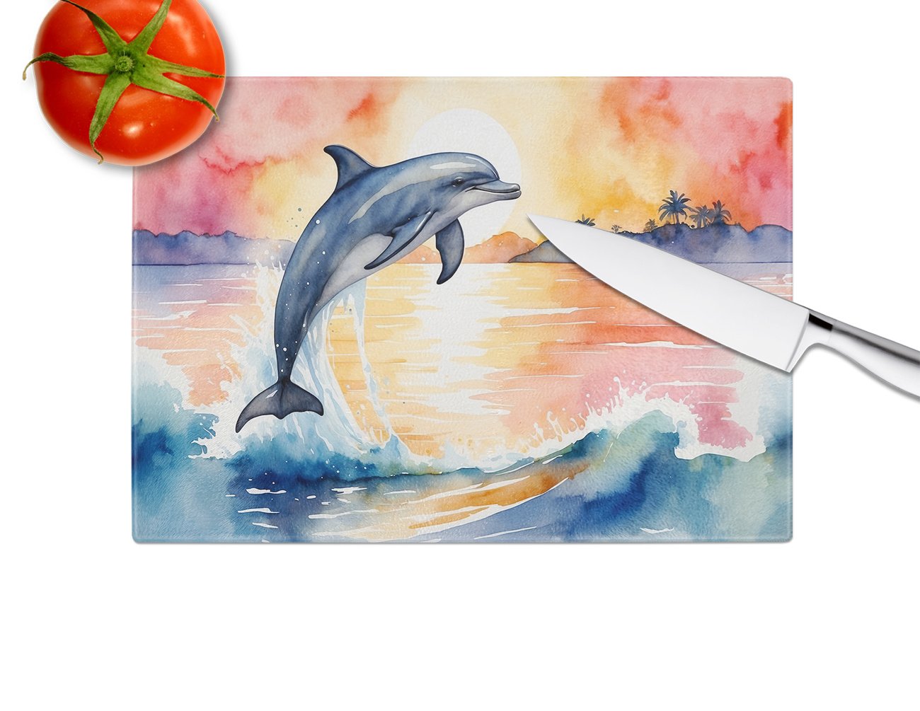 Glass Cutting Board featuring breed specific Dolphin artwork. Introduce your kitchen to the vibrant, large Decorative Glass Cutting Board from Caroline's Treasures. Crafted from resilient tempered glass, this board is not only a utilitarian necessity but also a colorful art piece. With its generous dimensions of 15 inches in height and 12 inches in length, it offers ample space for all your cutting needs. Every piece showcases captivating artwork from distinguished artists, bringing an aesthetic edge to your kitchen. Beyond its attractive design, this cutting board ensures your countertop stays pristine and unscathed, owing to its heat-resistant properties. Engineered with user convenience in mind, it features non-skid feet for stability, and rounded corners for additional safety. Its robust construction renders it virtually unbreakable, guaranteeing longevity. The board comes with protective feet bumpers, maintaining its position during use. This product is recommended to be hand washed only. Proudly printed and assembled in the United States, this cutting board exemplifies superior craftsmanship. With Caroline's Treasures' Decorative Glass Cutting Board, you're investing in a blend of functionality and artistic flair.