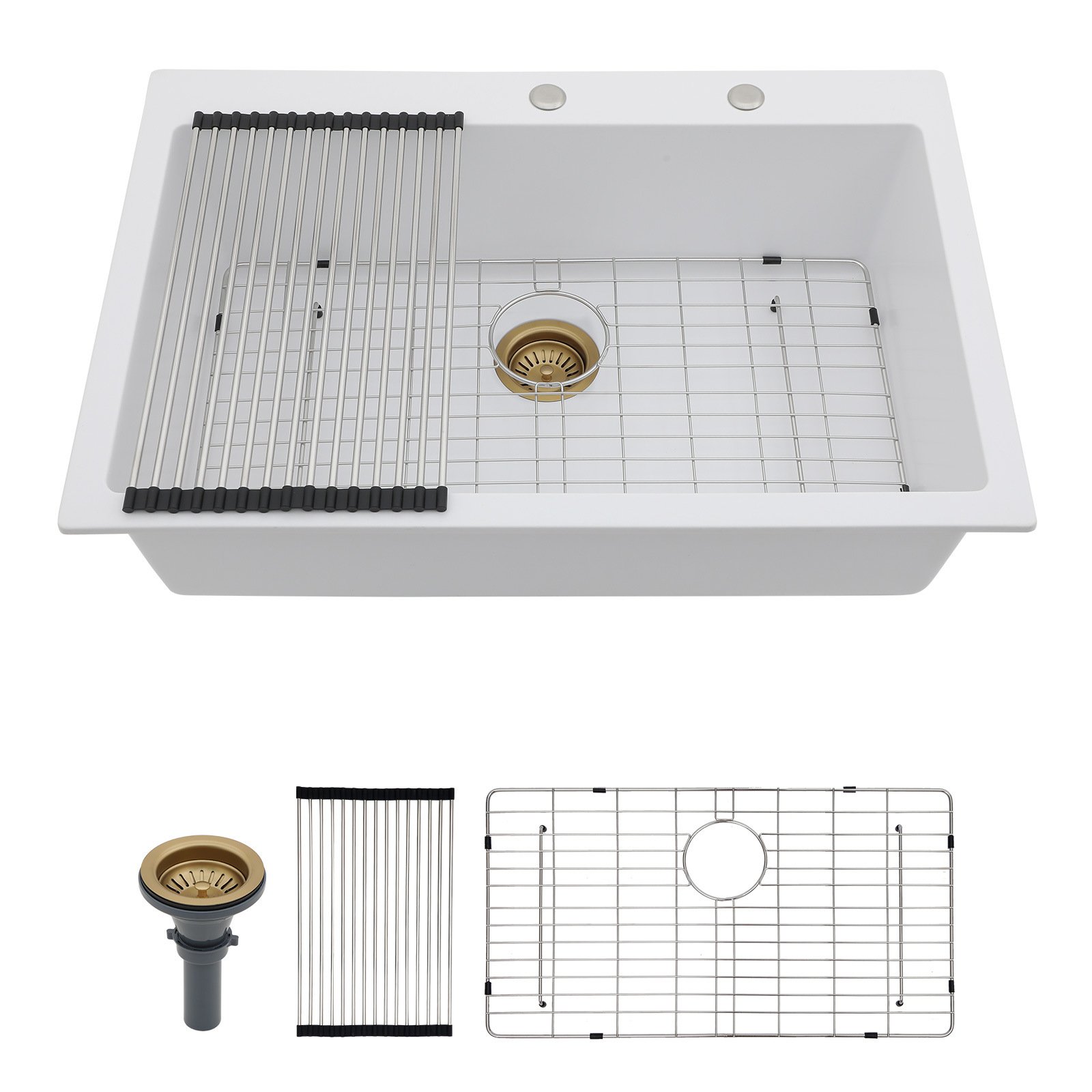 Product Name: Drop In Quartz Single Bowl White Kitchen Sink Top Mount Granite Composite Sink with Bottom Grid, Drainer, Roll-up Drying Rack
