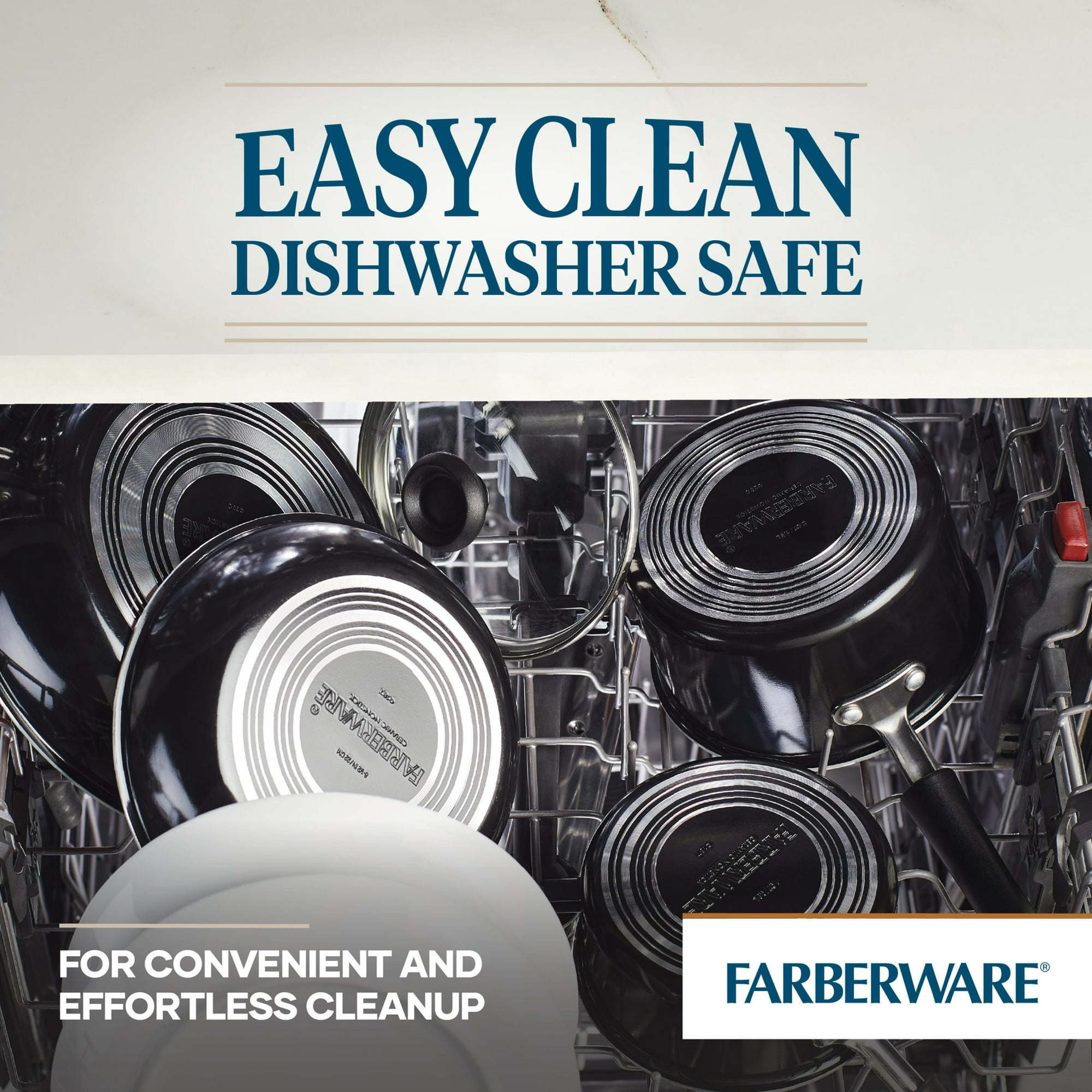 Equip the kitchen with the quality performance of Farberware’s Easy Clean Pro Ceramic Nonstick Cookware Set. Durable aluminum cookware is designed for quick, even heating so family meals are ready in no time. Pots and pans are finished with top-quality nonstick for effortless food release and are dishwasher safe for quick and easy cleanup.