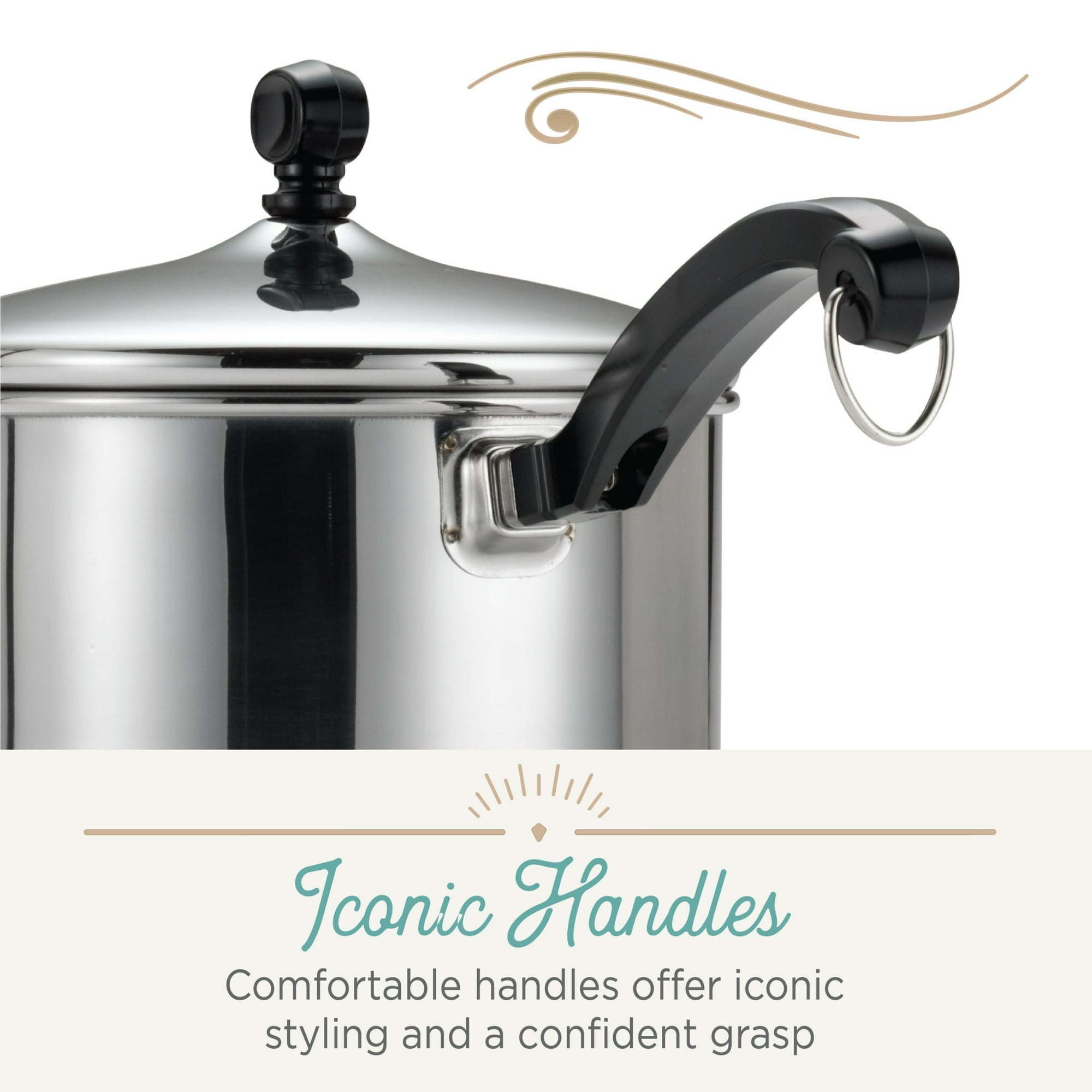 DURABLE CONSTRUCTION, COMFORTABLE DESIGN: Comfortable handle with iconic styling provides a confident grasp; stainless steel, snug-fitting lid boasts bell shape, rolled rim and stylish knob