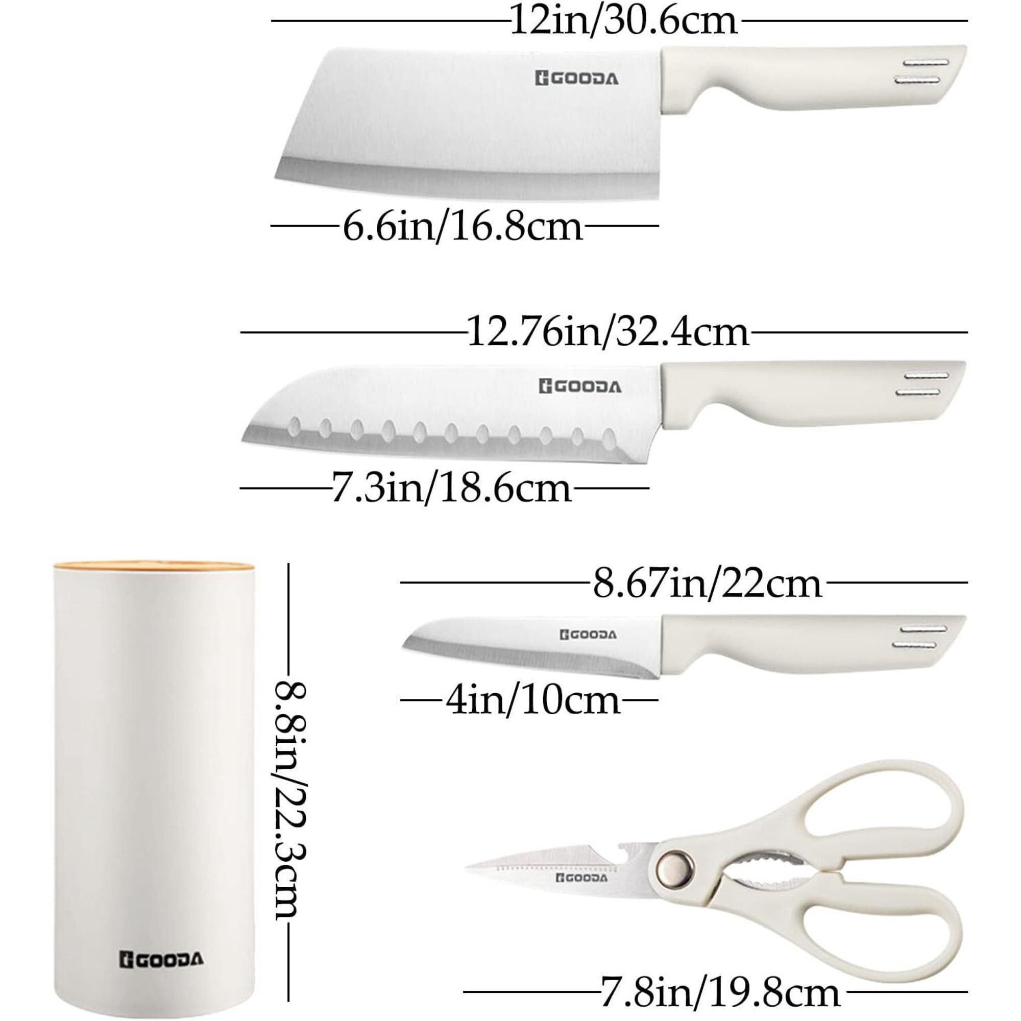 Product Size: 6.6" Cleaver Knife, 7.3" Chef Knife, 4" Fruit Knife, 7.8" Kitchen Scissors, 8.8" Knife Holder.