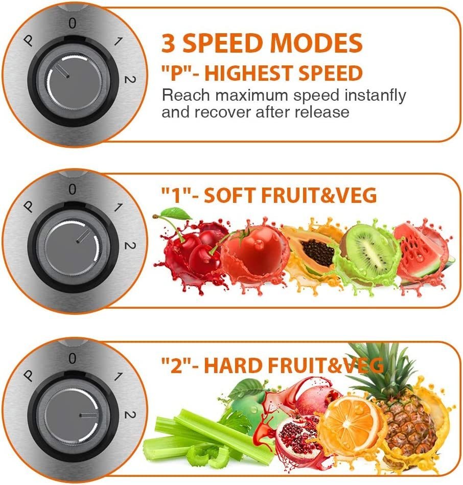Rotary button with spiral design for comfortable hand feel; easier; less effort and more convenient to use. The juice extractor has 2 speed with different speeds. "1" is a low speed; for soft fruits vegetables such as oranges; watermelon; tomato; etc. "2" is a high speed; for hard food like apple; carrot; celery; etc. 'P' is the highest speed. (Reach maximum speed after release).