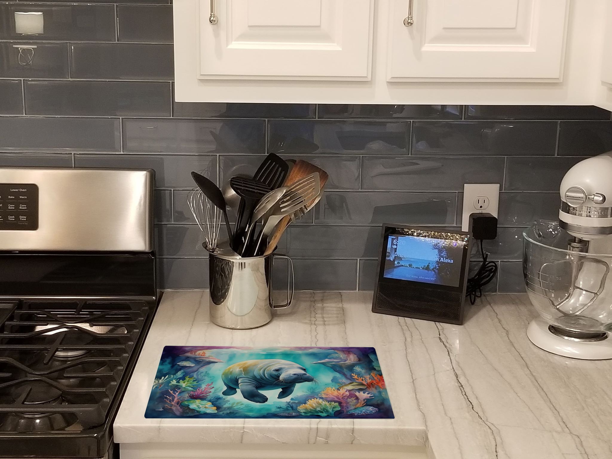 Glass Cutting Board featuring breed specific Manatee artwork. Introduce your kitchen to the vibrant, large Decorative Glass Cutting Board from Caroline's Treasures. Crafted from resilient tempered glass, this board is not only a utilitarian necessity but also a colorful art piece. With its generous dimensions of 15 inches in height and 12 inches in length, it offers ample space for all your cutting needs. Every piece showcases captivating artwork from distinguished artists, bringing an aesthetic edge to your kitchen. Beyond its attractive design, this cutting board ensures your countertop stays pristine and unscathed, owing to its heat-resistant properties. Engineered with user convenience in mind, it features non-skid feet for stability, and rounded corners for additional safety. Its robust construction renders it virtually unbreakable, guaranteeing longevity. The board comes with protective feet bumpers, maintaining its position during use. This product is recommended to be hand washed only. Proudly printed and assembled in the United States, this cutting board exemplifies superior craftsmanship. With Caroline's Treasures' Decorative Glass Cutting Board, you're investing in a blend of functionality and artistic flair.