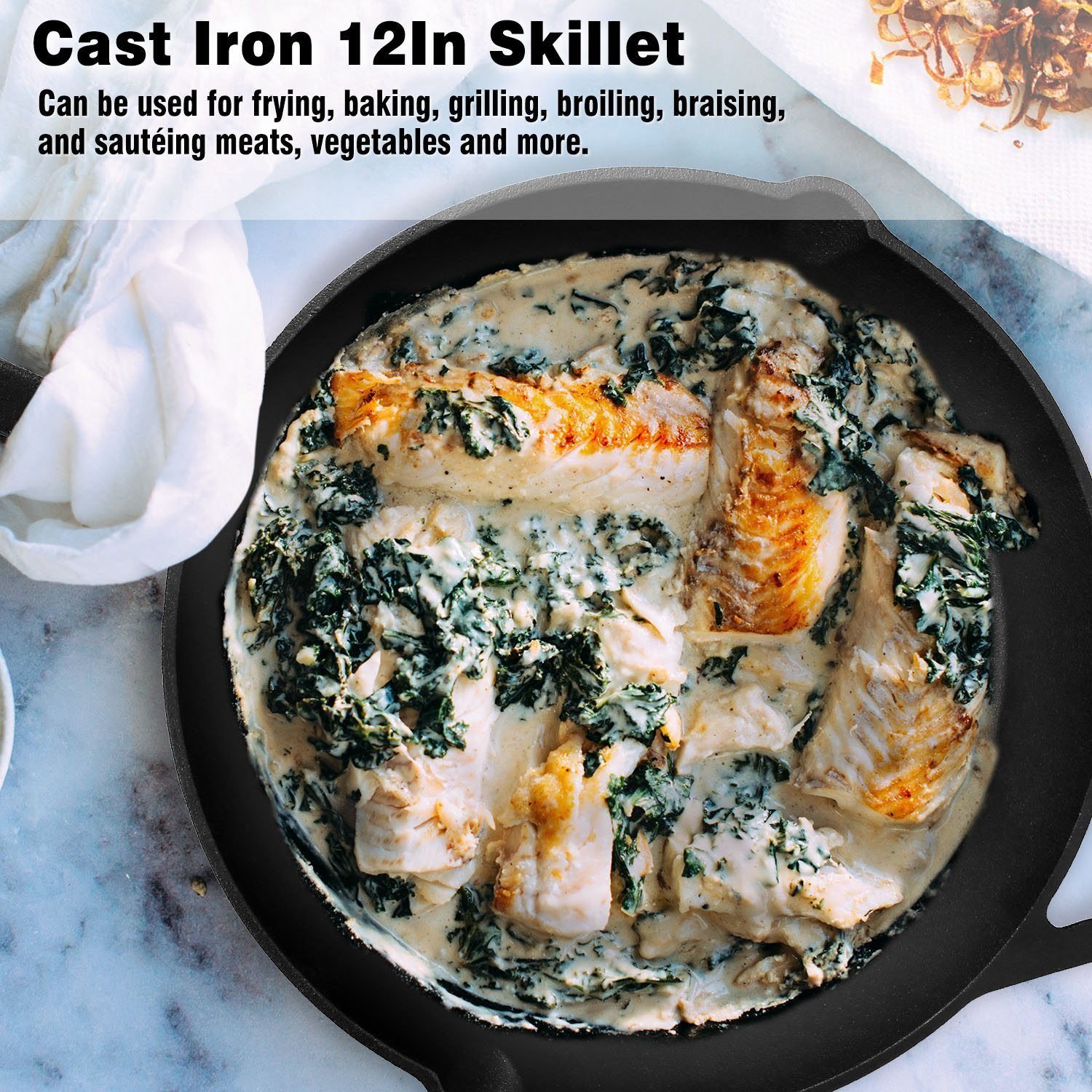 Pre-Seasoned Cast Iron Skillet Oven Safe Cookware Heat-Resistant Holder 12inch Large Frying Pan