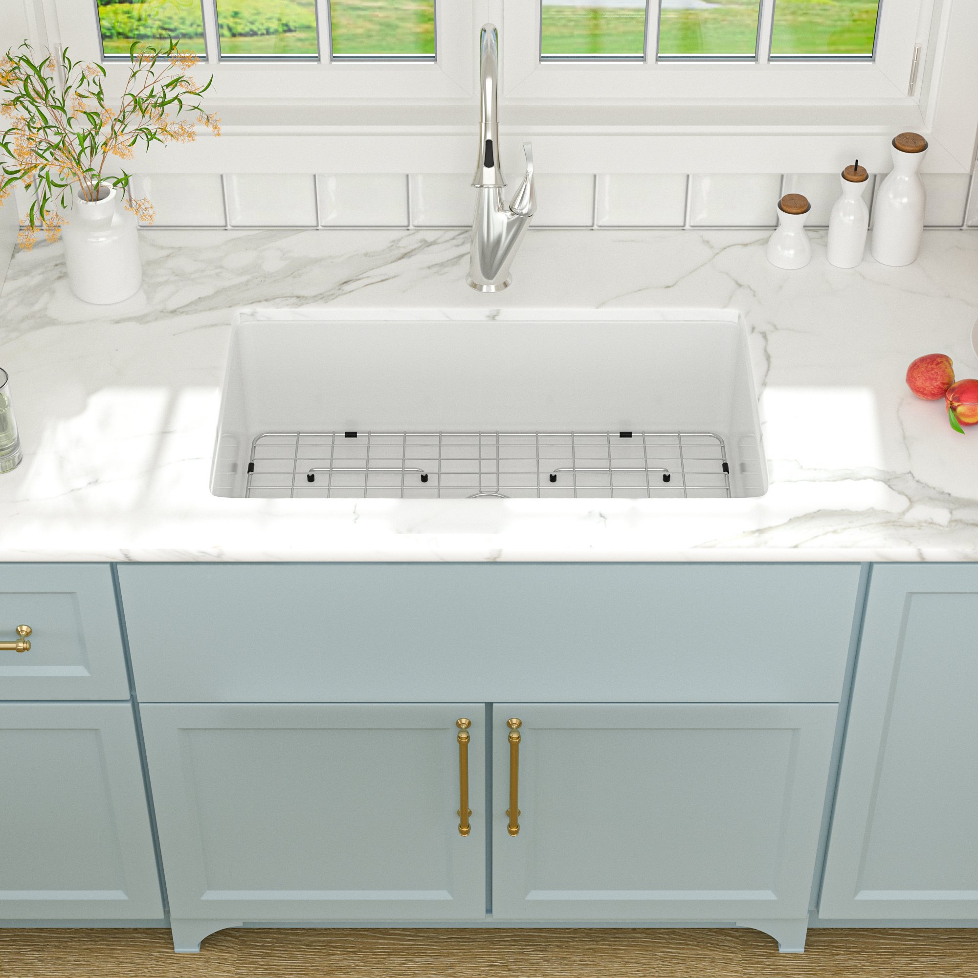 5.Kitchen sink comes with bottom grids and strainer. It is worth to get this ceramic sink with everything in it and you needn’t purchase separately. The custom bottom grid fits perfectly and will stay in the sink to prevent possible chipping of the finish in case or you drop a heavy pan in it, and it will also allow suds from rinsing to pass under the dishes.