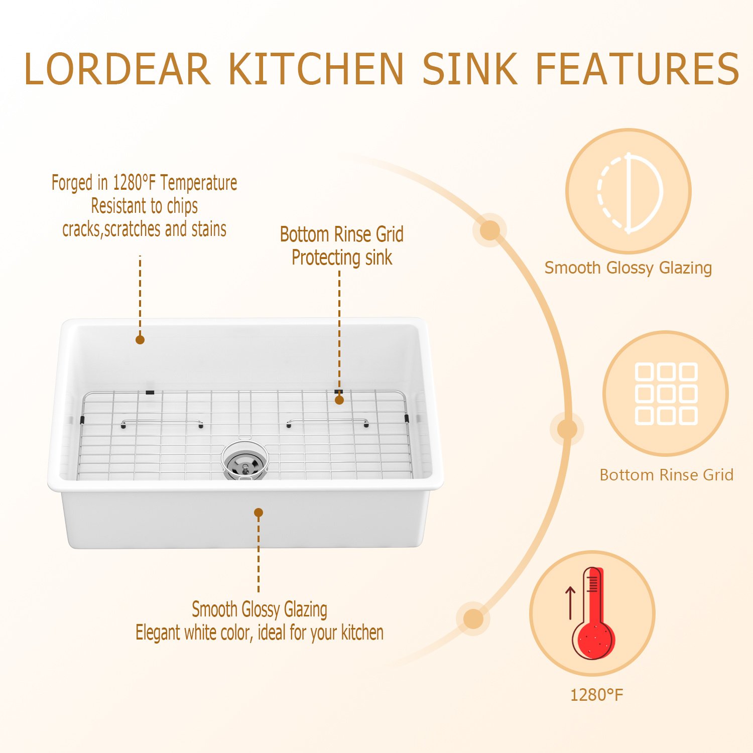 3.This kitchen sink is made from a combination of kaolin fired continuously at high temperatures, which provides extreme strength and durability for long-term use. The well-glazed and smooth surface provides excellent resistance to scratches and stains. Easy to clean, no worries about discoloration and rust.
