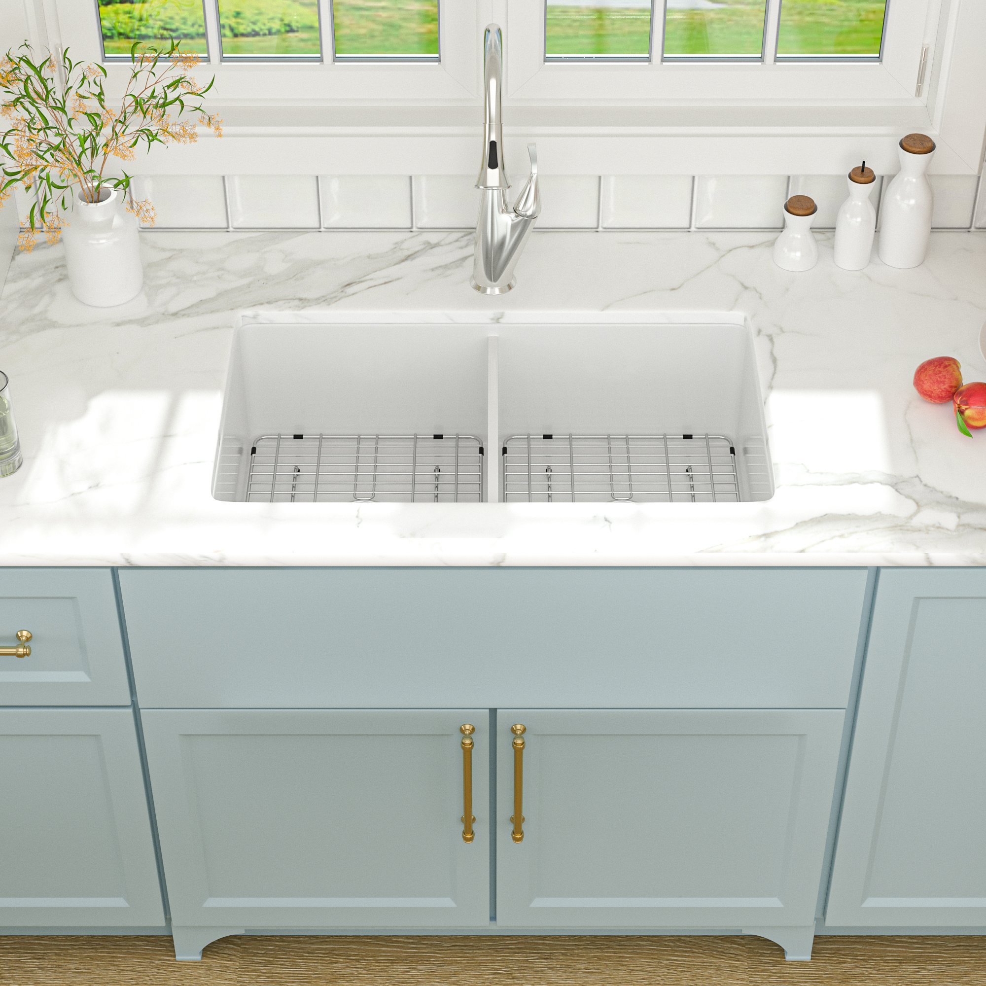 Double Bowl: a ceramic sink, two sink bottom grids,two basket strainers and instruction;