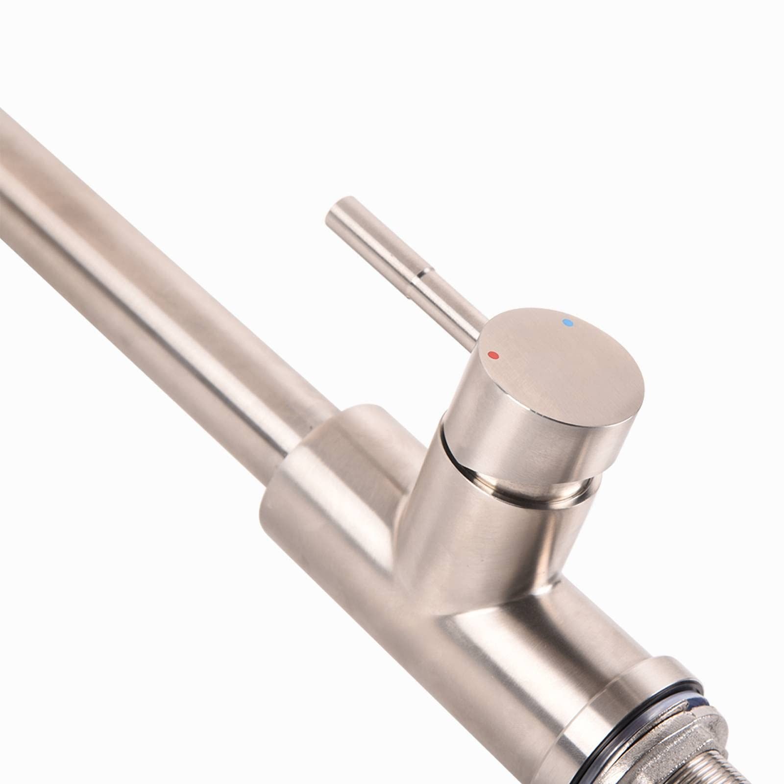 Durable Brushed SUS304 Stainless Steel- resists tarnish and corrosion from daily use. Premium Ceramic Disc designer faucet: smooth stream/spray water flow, drip-free.