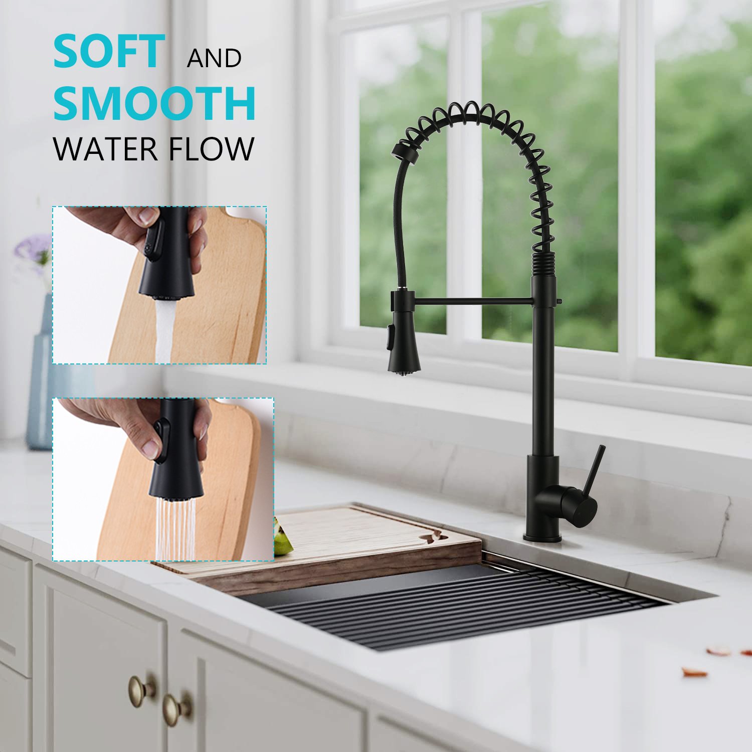 The Spring Pull Down Faucet is constructed of durable materials to meet all of your kitchen's needs. Stainless steel construction provides durability, making this product a reliable selection for a busy home. 360 Degree Swivel Pull Down Sprayer provideS a full range of motion so you can wash your dishes from any angle . The sleek design also helps to bring a professional look to your kitchen. Its premium finish complements the look of your space and pairs well with any countertop.
