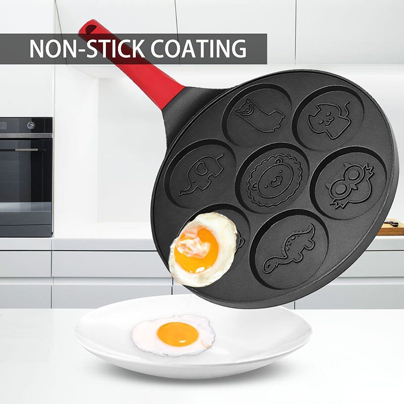 Nonsticky Pan Coating- Our pan is coated with 100% PFOA free non-stick coating in cute healing color, not only baking for teenagers and kids but also make yourself relaxing when you flip those pancakes 7 Pancake Maker - 3-Inch flapjack pancake maker for blinis and crepes in fun shapes with this holiday pancakes molds. 7 pancake mood : Elephant, Alpaca, Cat,owl, Dinosaur, hippo, lion PREMIUM MATERIAL: Made of die cast Aluminum, 10 inches diameter and 1/2 inches height, each cavity measure 3 inches. 17 Inches length including the silicone handle BROAD COOK TOP VERSATILITY: Heavy duty pan works on Gas, Halogen, Ceramic Cook tops, stove grill ; Use for pancakes, crepes, blinis & blintzes Induction Cook tops Not Applicable ! Do not put in dishwasher as it will shorten the life of the nonstick coating on the pan and may dull the exterior of the pan