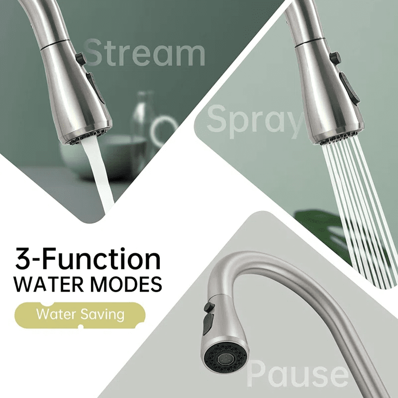 2.Your kitchen faucet provides a choice of aerated Stream for non-splash cleaning and filling, a powerful Spray for rinsing, and a pause for saving water, satisfying your various cleaning needs.