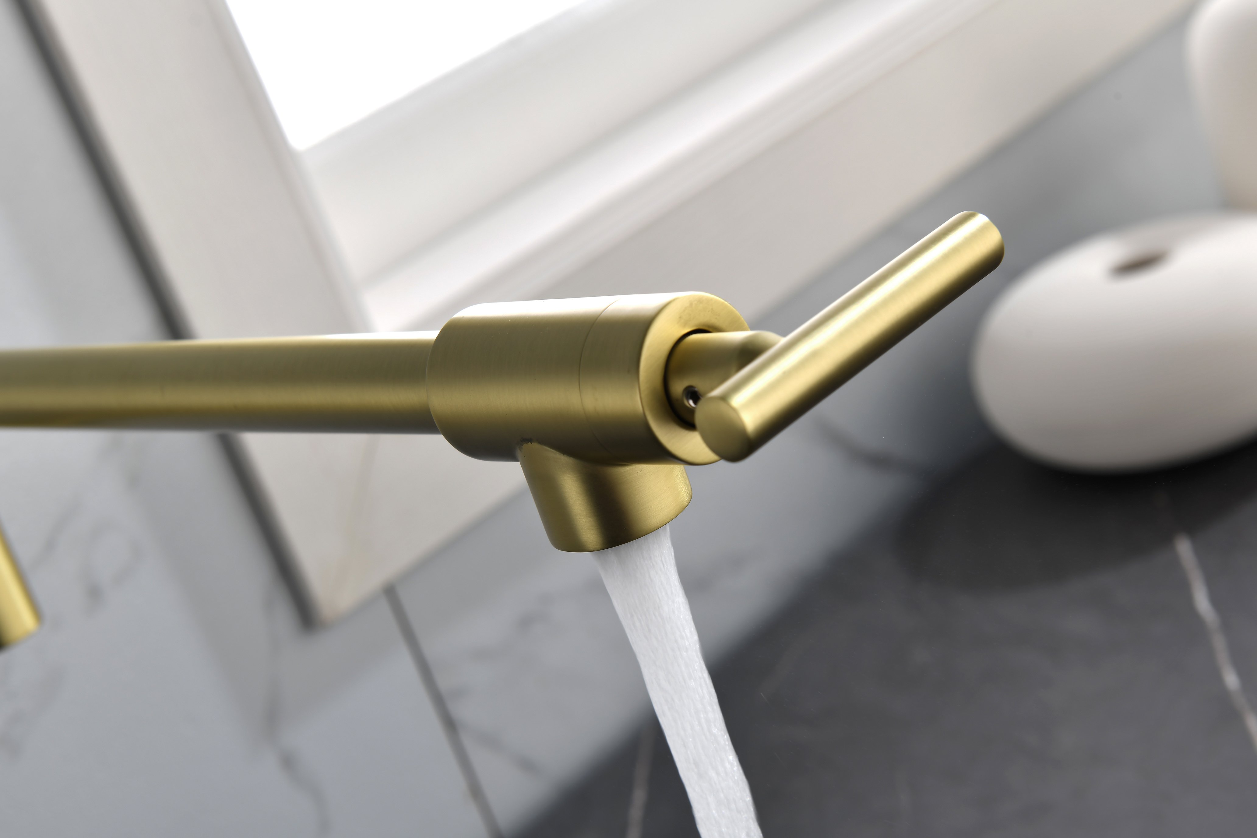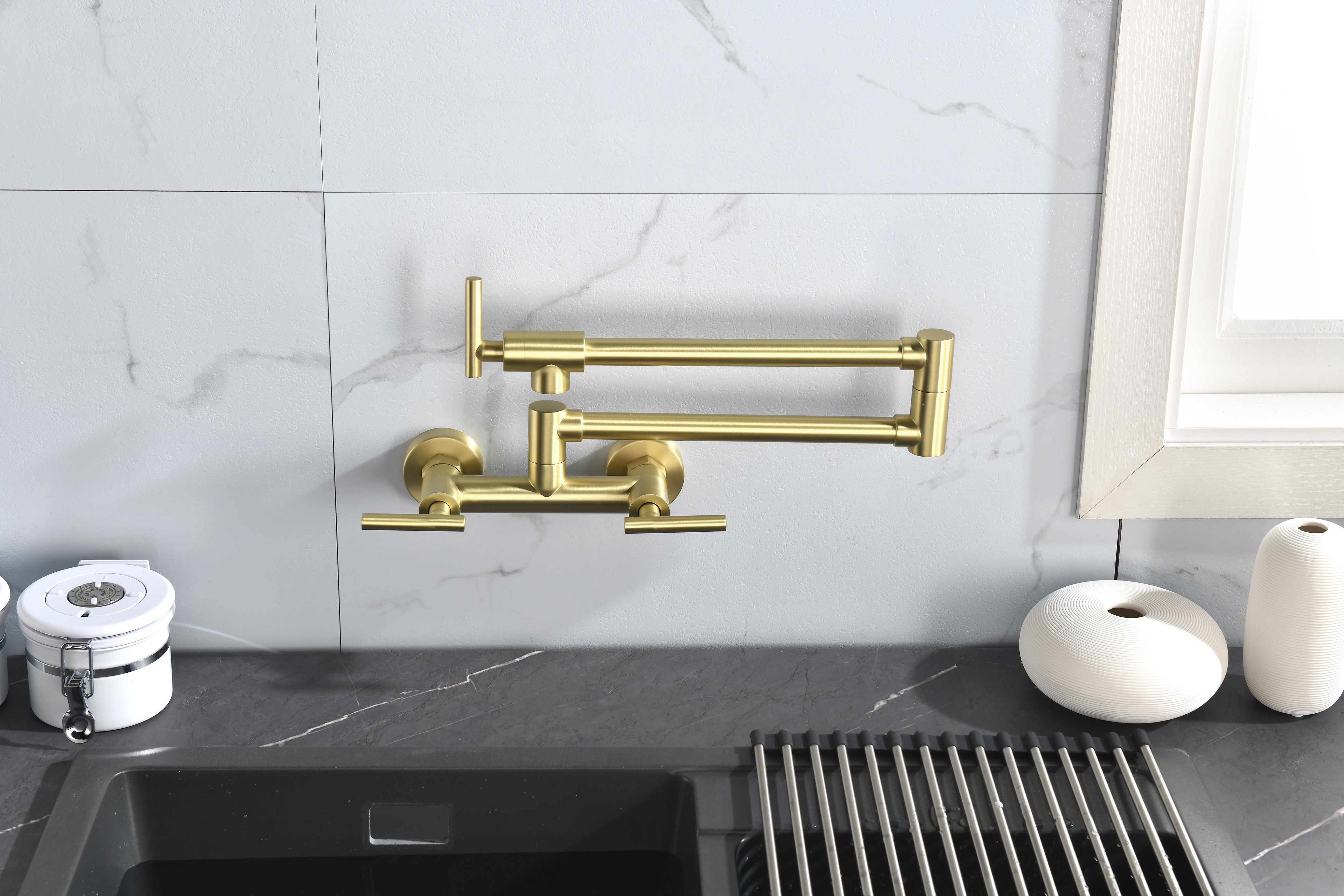 Save the space: 2 handles 2 holes folding wall-mount style leaves enough space and room; double joints of the faucet and 360 degree spout rotation add more convenience; you can pull out or retract smoothly for doing multiply works