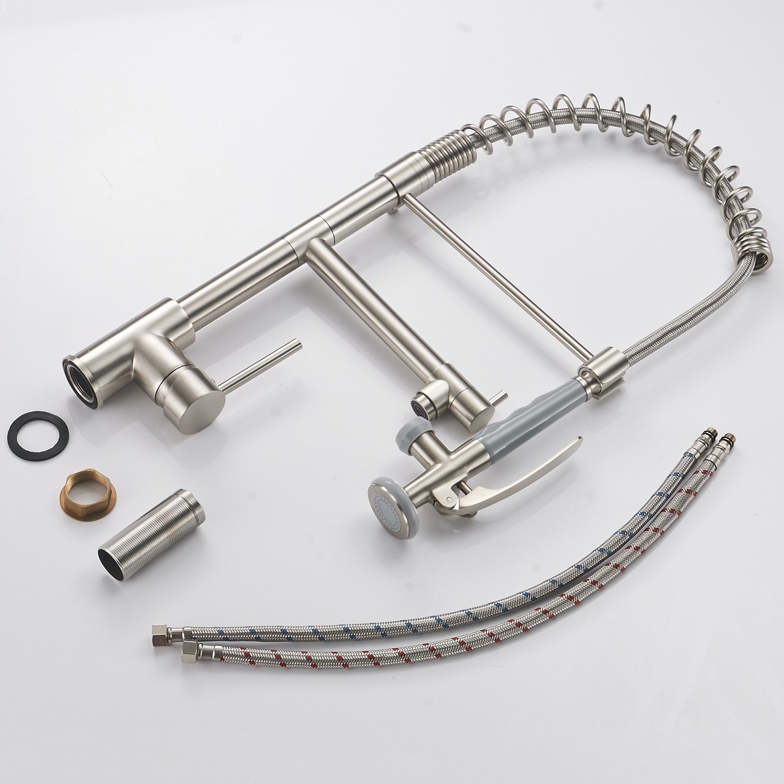 This spring kitchen faucet with pull-down sprayer is the perfect combination of decorative and functional, dedicated to improving kitchen efficiency and creating the modern kitchen of your dreams. The firm docking arm not only helps you to fix the sprayer, but also can be used as a hanging bar for towels, thus saving your kitchen space.The pull-down sprayer and 360-degree rotatable spout design gives you great maneuverability and maximum range of motion for easy all-around cleaning and water-filling tasks.
