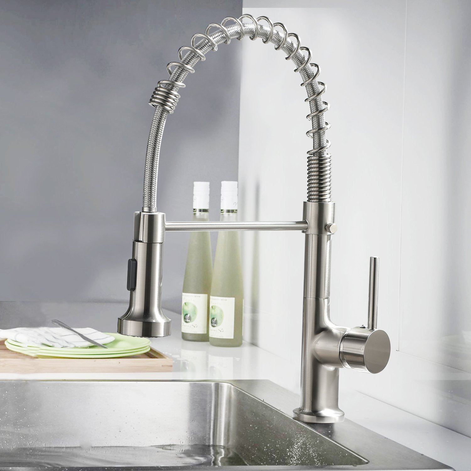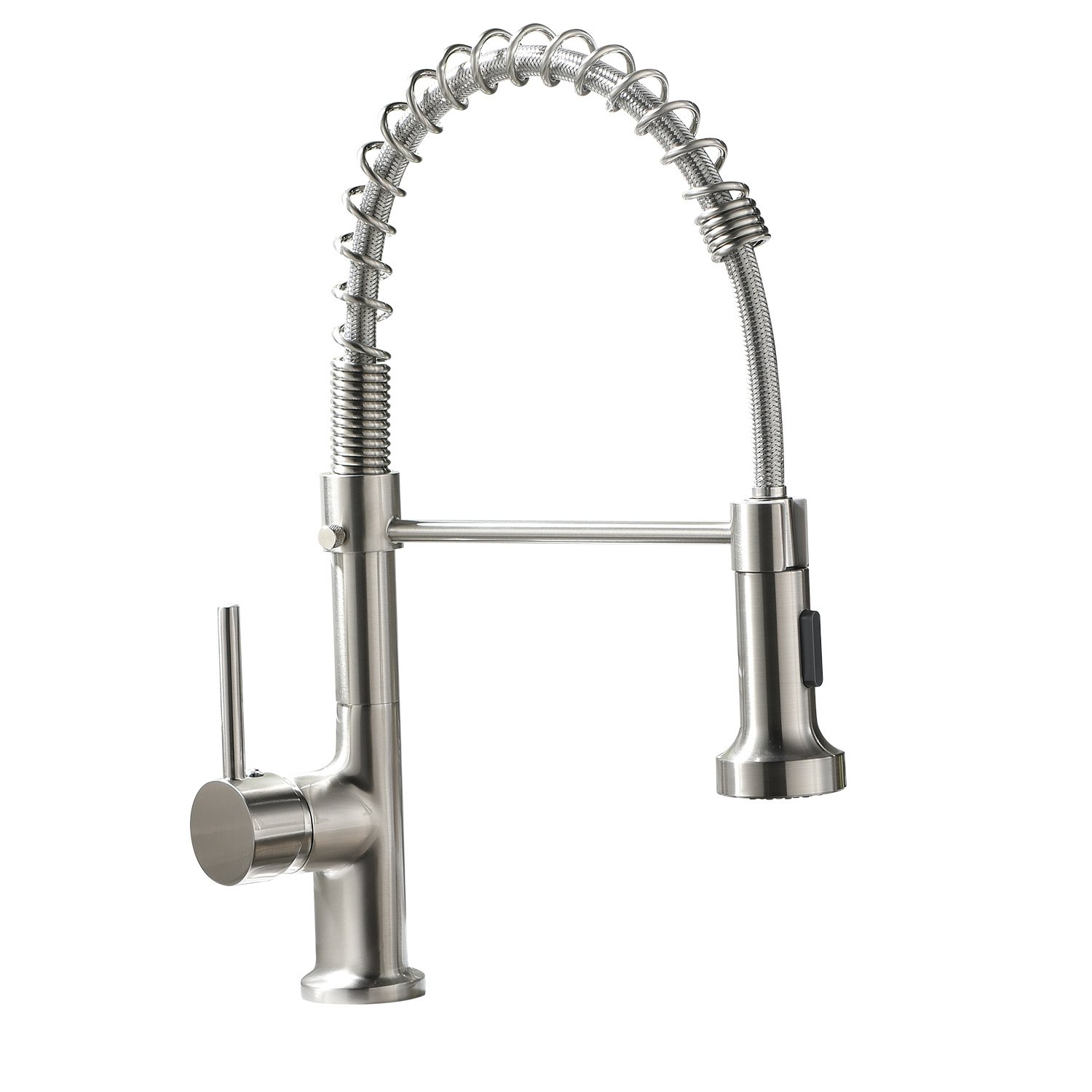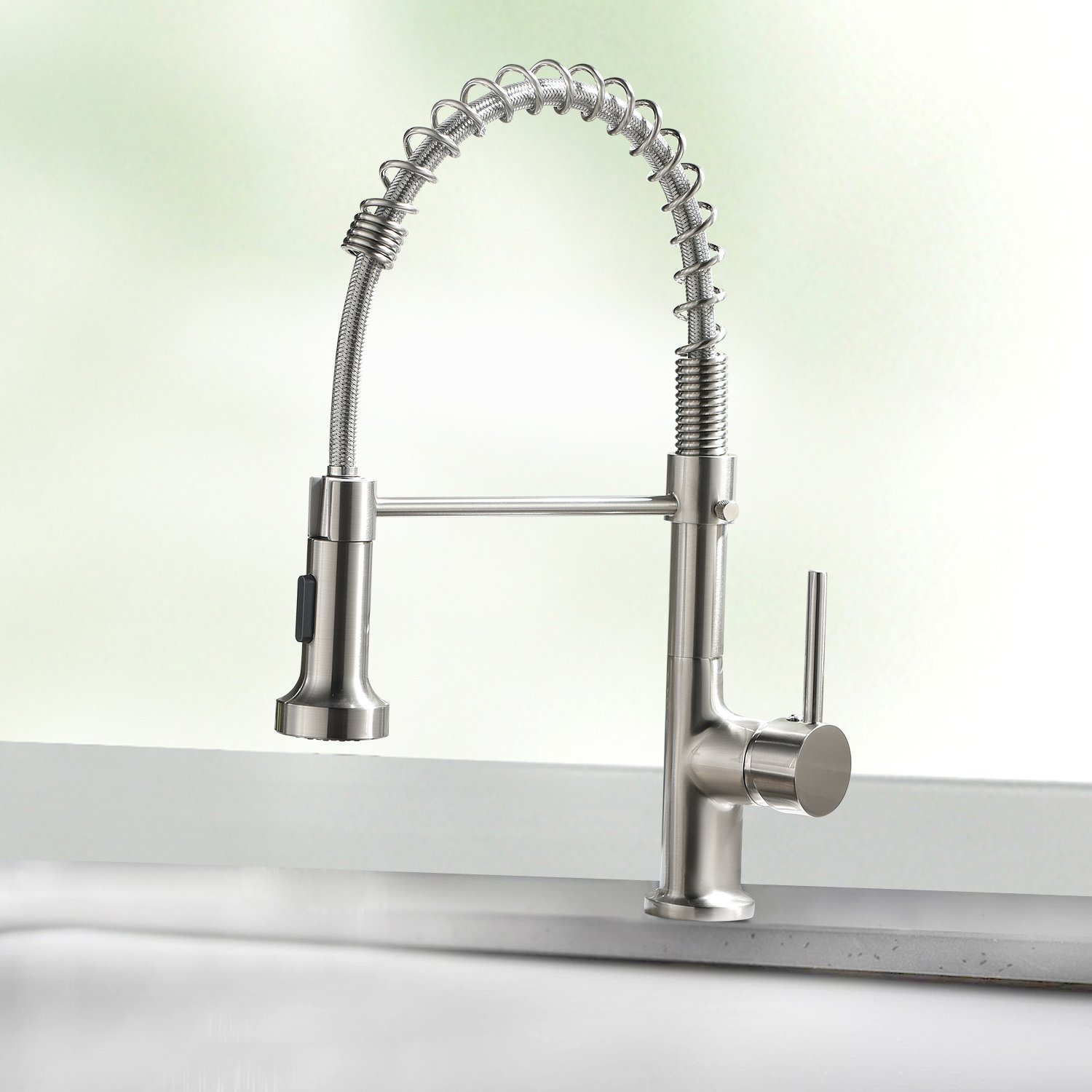 Give your space a stylish refresh with the Kitchen Faucet with Spring Spout. A dual-action head is attached to a retractable, nylon-wrapped hose, providing the choice of an aerated stream or a powerful spray. The high-arching, swiveling spring spout makes cleaning large pots and pans a breeze, and displays a professional look that's sure to make a statement.