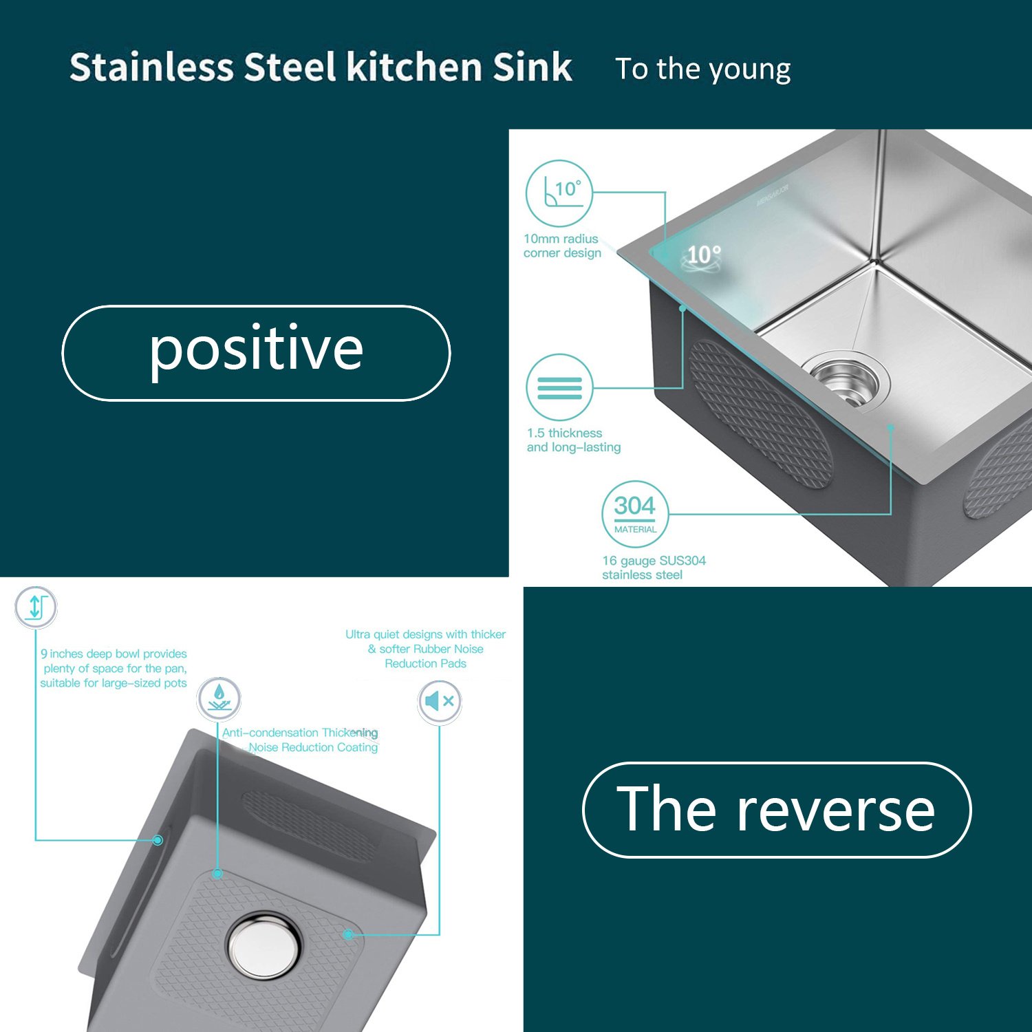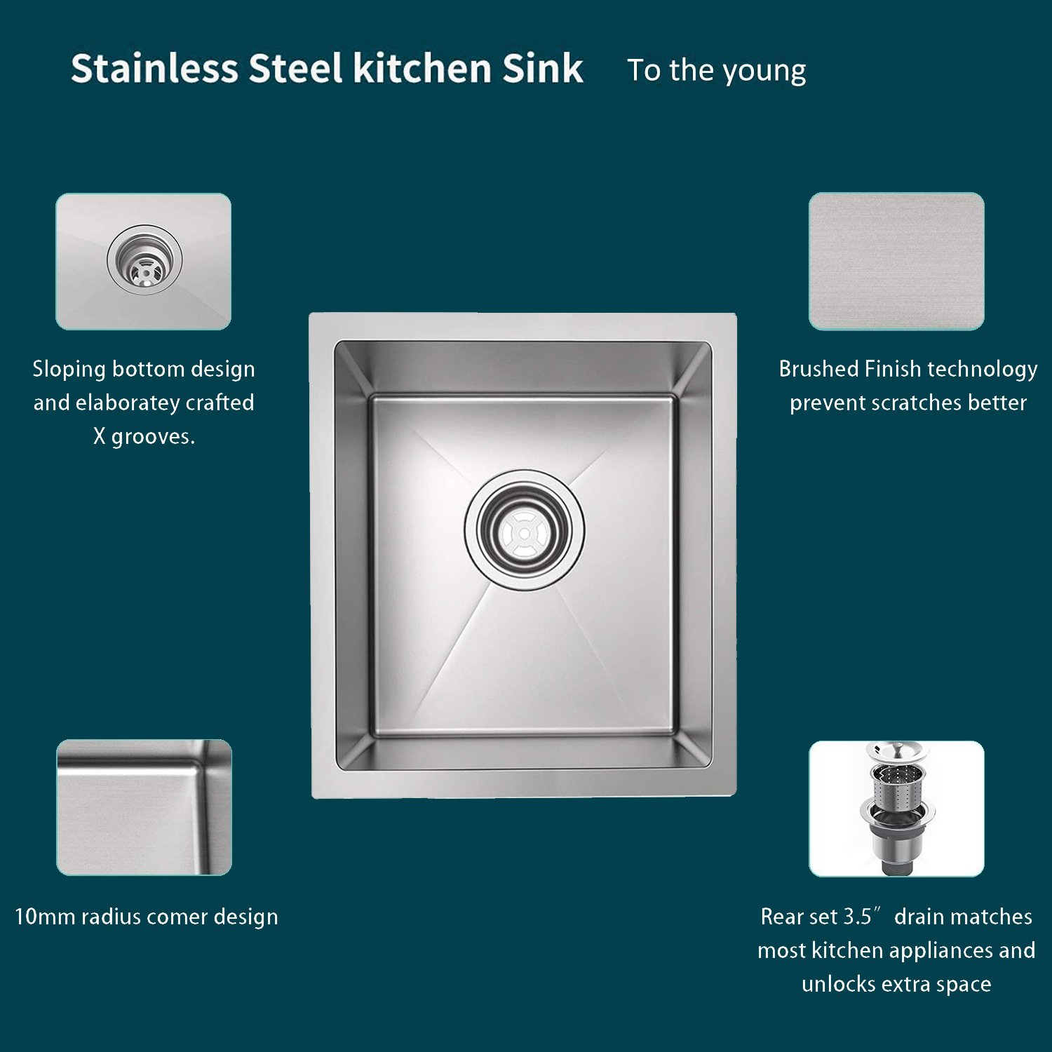 14" x 14" stainless steel single bowl kitchen sink offers professoional style with easy to clean curved corners.
